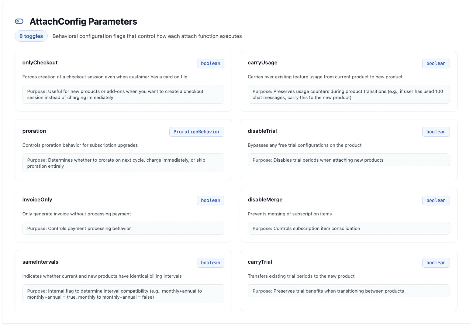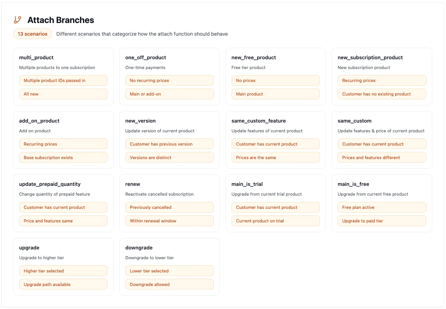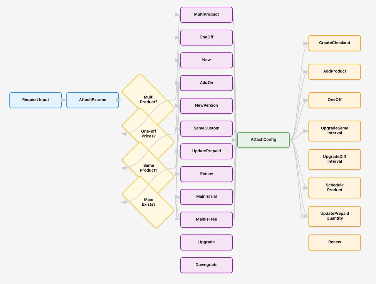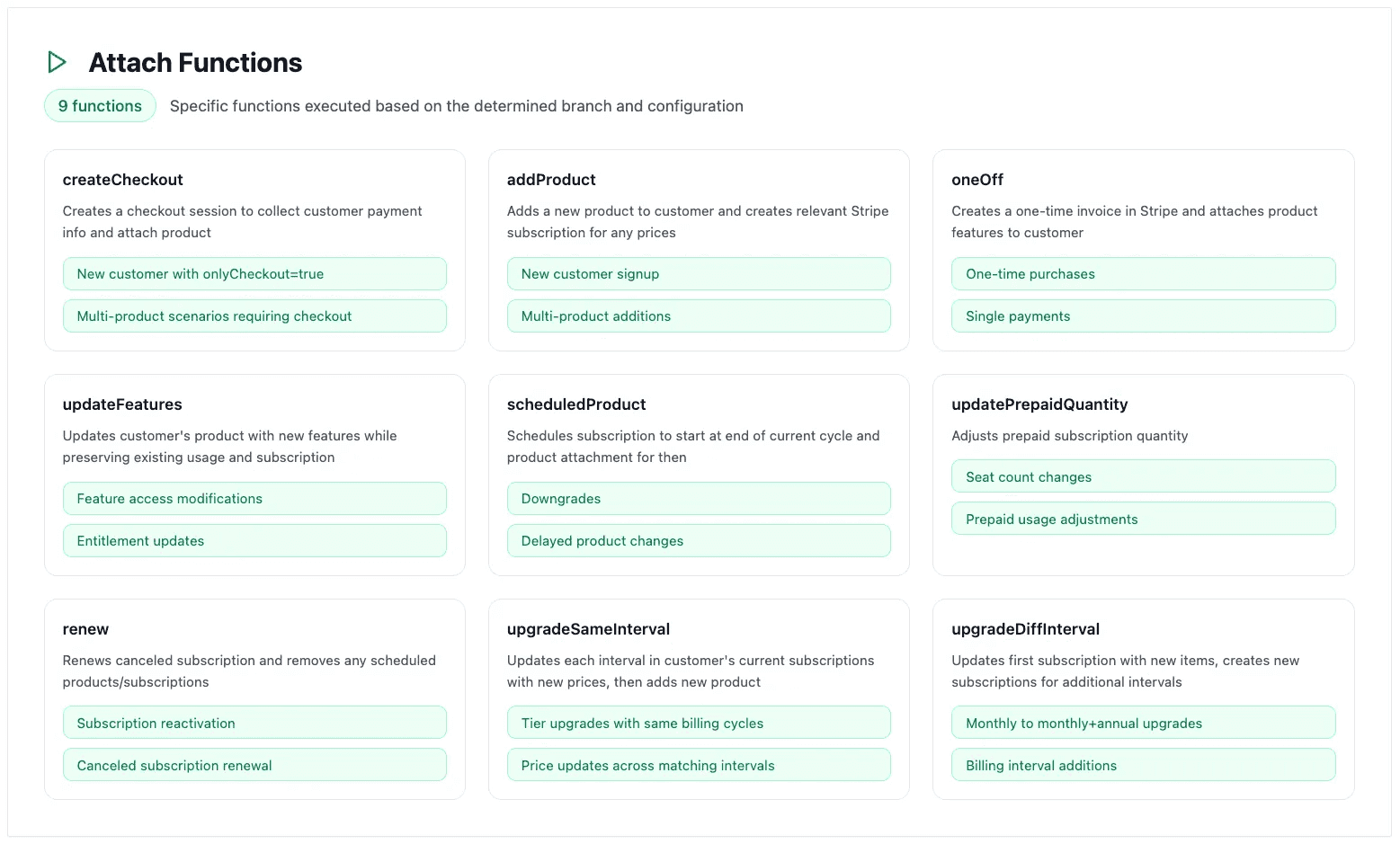 Stripe’s low-level design maps each action to a different function. When designing Autumn, we were pretty strong in our belief that all these cases should just be 1 endpoint: POST /attach