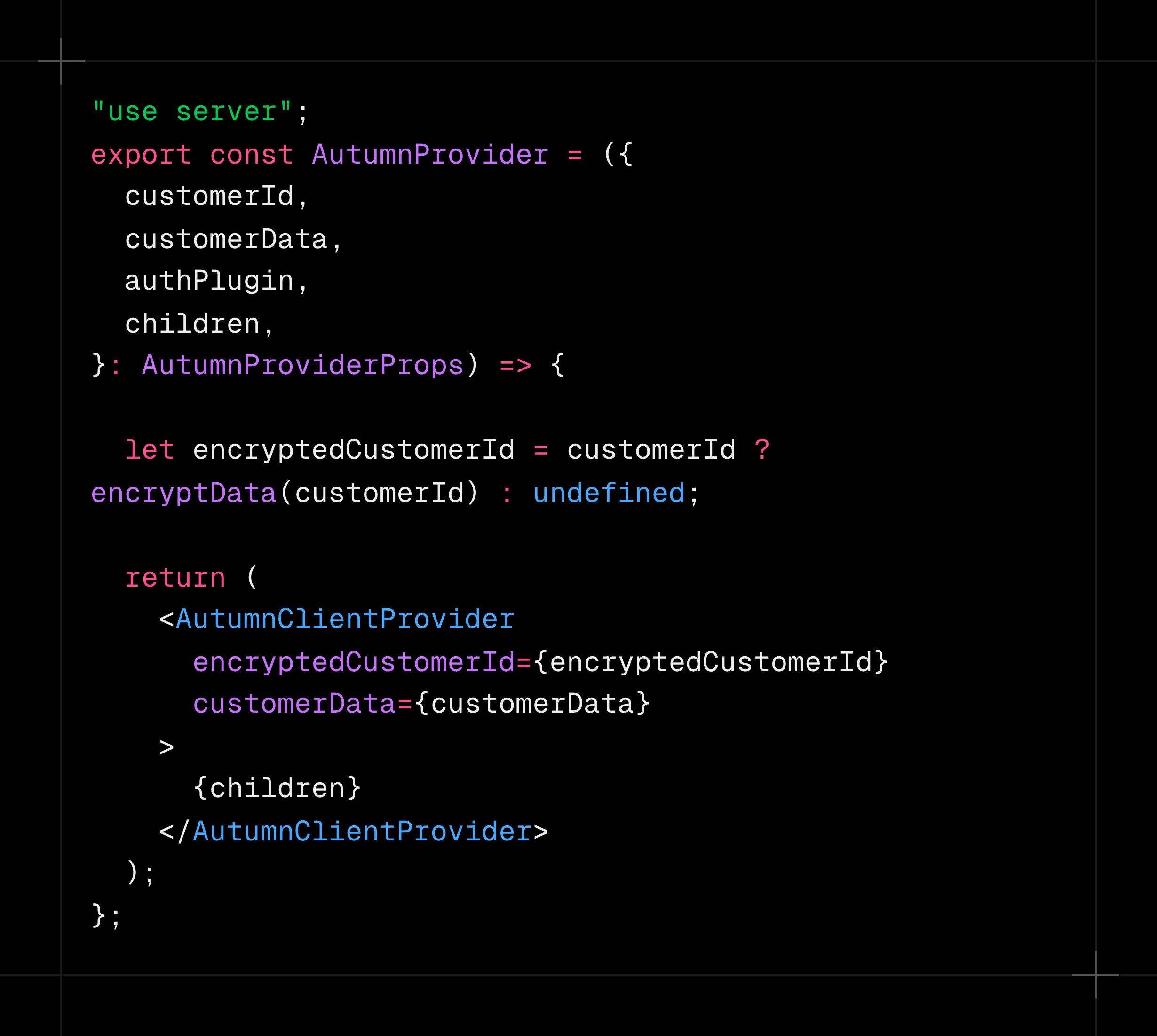 encryptedCustomerIdfrom context and passes it to the server action. These are all exported through a hook —useAutumnEach server action first decrypts the customer ID then calls the Autumn API