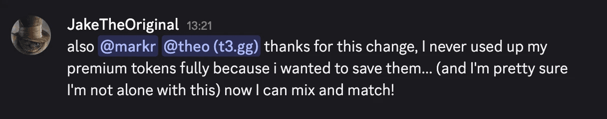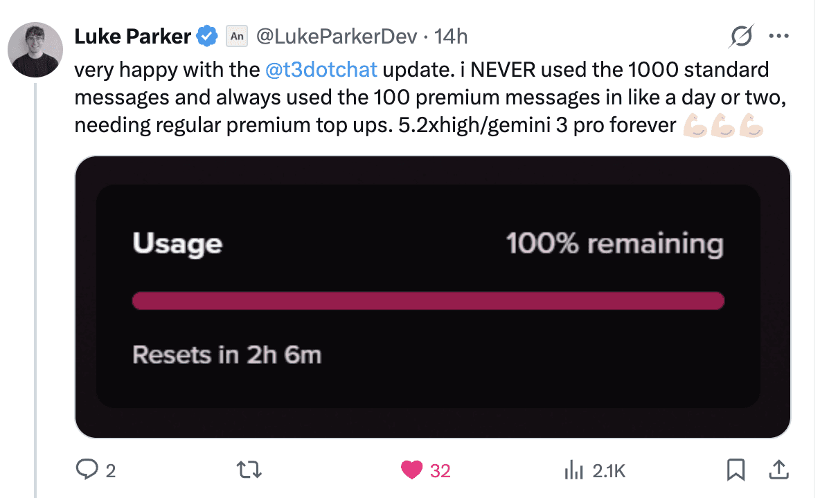 The first reason behind the change is to address what Theo calls "fear of running out". Whenever users hit enter to send a message to T3, there's a latent anxiety that comes with watching your usage counter slowly tick up.